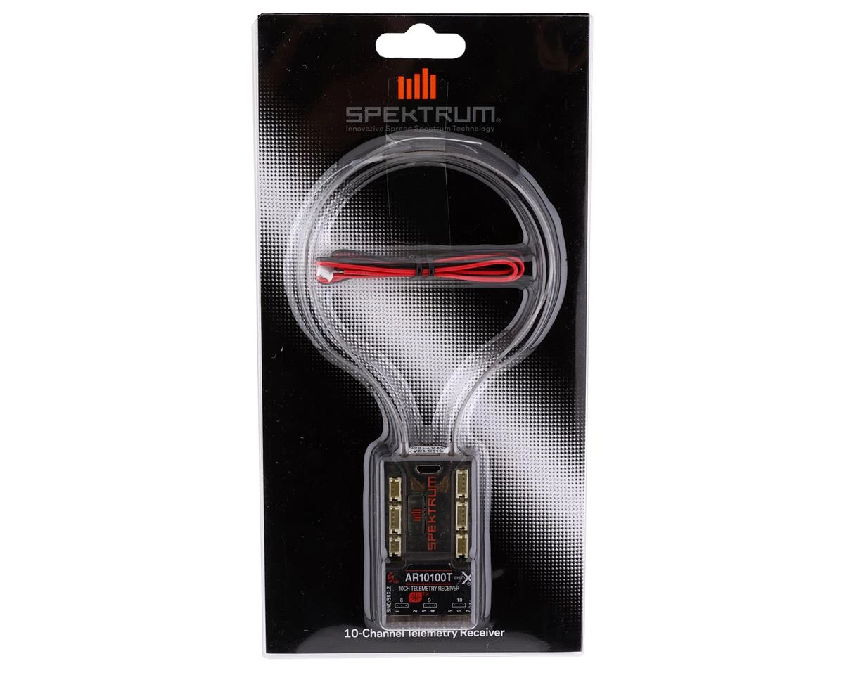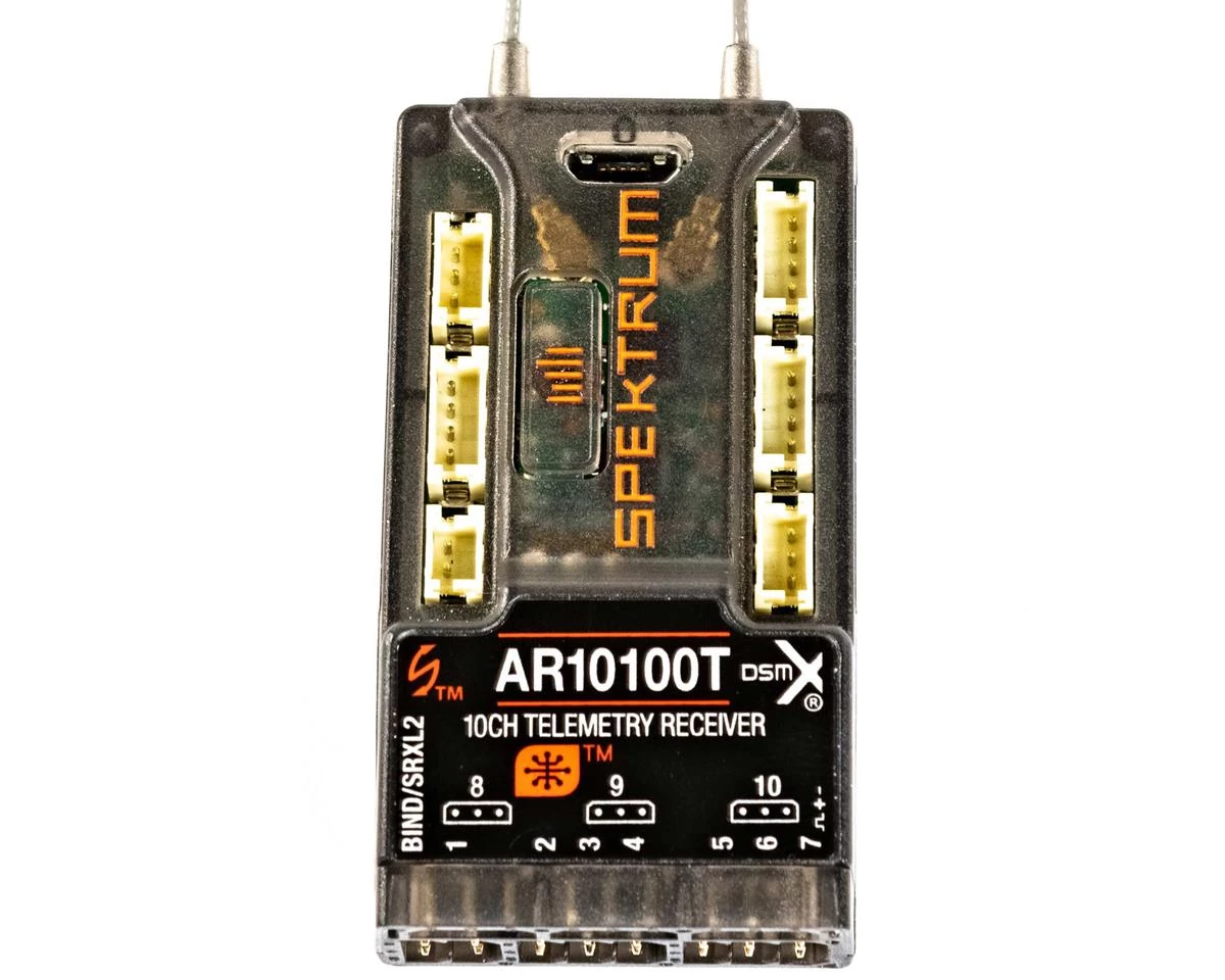 The AR10100T DSMX/DSMN2 10 Channel Telemetry Receiver from Spektrum RC is a compact receiver that supports a host of advanced level features to suit the needs of a wide variety of pilots. It boasts full range telemetry, an included barometer, a built in bind button, and an onboard micro USB port for quick connection to the Spektrum RC PC Programmer and it’s application. With the ability to connect with up to two additional SRXL2 remote receivers (such as SPM9747, or SPM4651T), receiver performance will be incredibly high thanks to not only the two on board antennas, but the option to add additional receivers for the best reception in any aircraft. Spektrum SMART users will also enjoy SMART functionality for SMART equipped ESCs that feature one wire telemetry data without the need of modules, links, or wires.