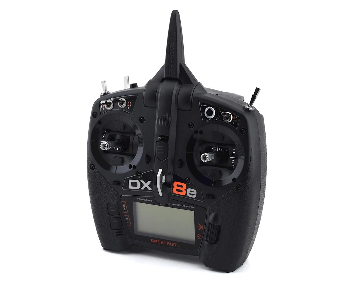 The Spektrum DX8e 2.4GHz DSMX 8 Channel Radio makes it easy to upgrade from a limited 6-channel radio to a far more versatile 8-channel system with computer functionality. The Spektrum DX8e gives you the unbeatable response of DSMX technology, the simplicity of Spektrum AirWare firmware as well as many other features you won’t find on other “budget” radios.