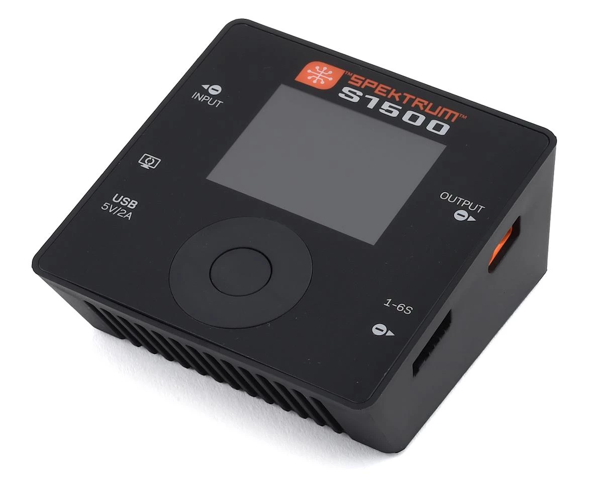 For input power, use a Spektrum Power Supply unit (SPMXC10201, available separately) or any compatible DC power source with the included IC3 power cable adapter. The S1500 charger has a USB port, a software update port, plus a safety timer and protection against heat, reverse polarity, short circuit, over-current, and low input voltage.