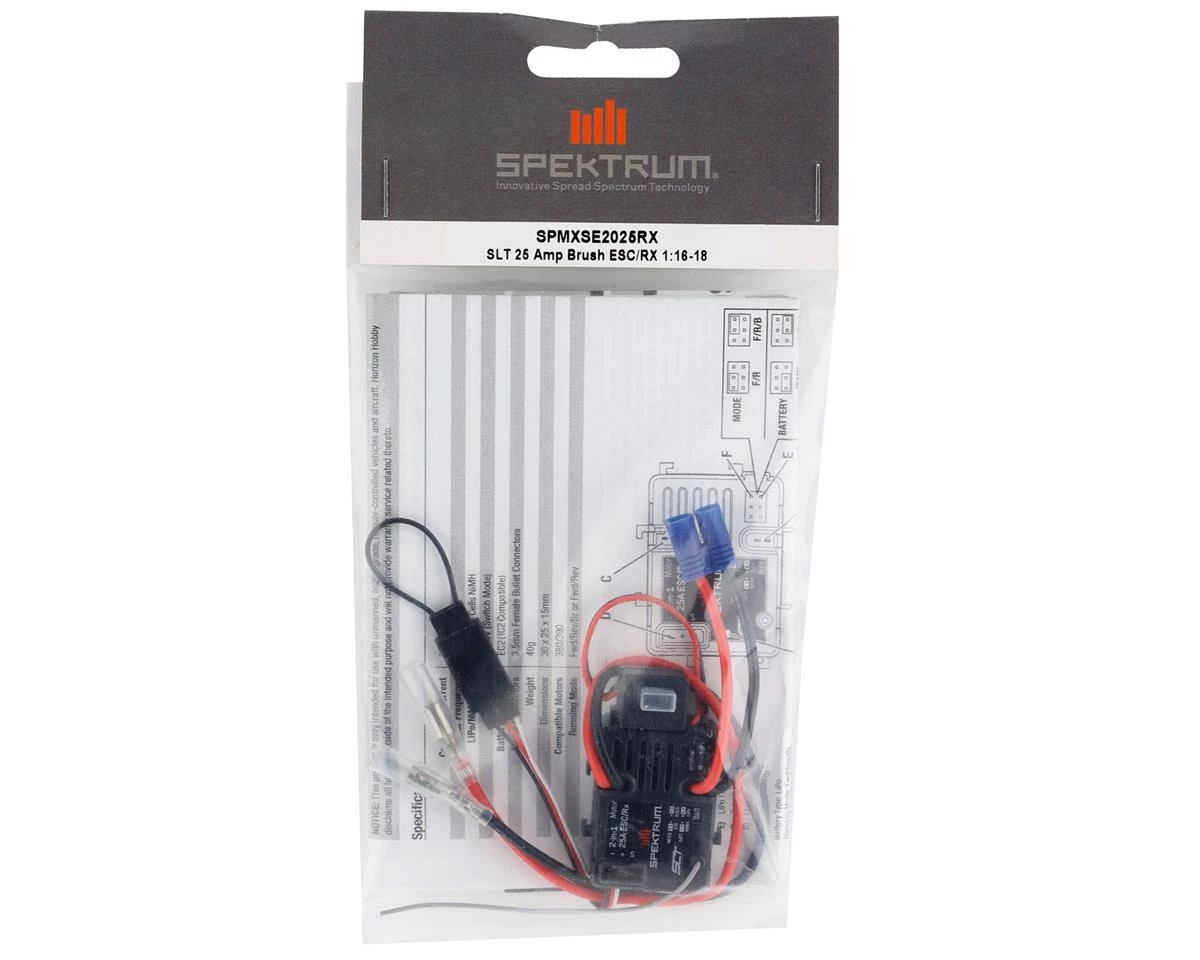 Spektrum SLT 25 Amp Brushed ESC/RX. This is a replacement ESC and receiver combo unit intended for the Losi Mini JRX 2. Package includes one SLT 25 Amp Brushed ESC/RX combo with EC2 connector and bind plug.