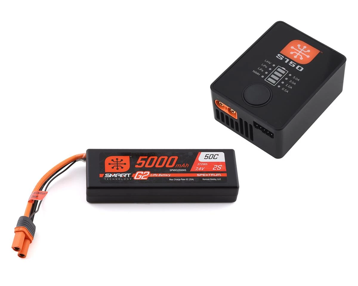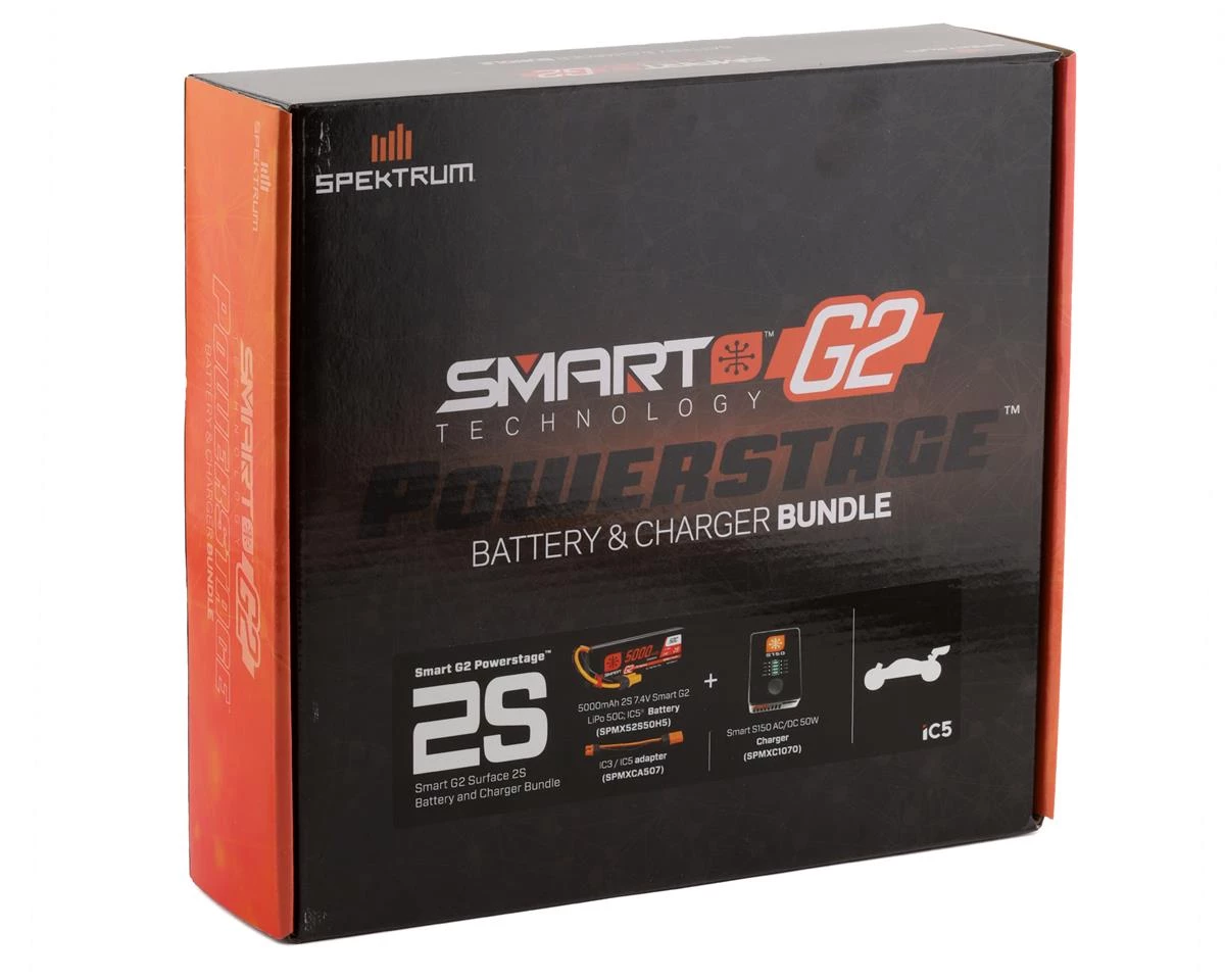 This is a Spektrum RC Smart G2 PowerStage 2s Bundle that includes a one box solution that includes one 2s LiPo 5000mAh Battery, and charger to suite many vehicle requirements that need 2s LiPo power.